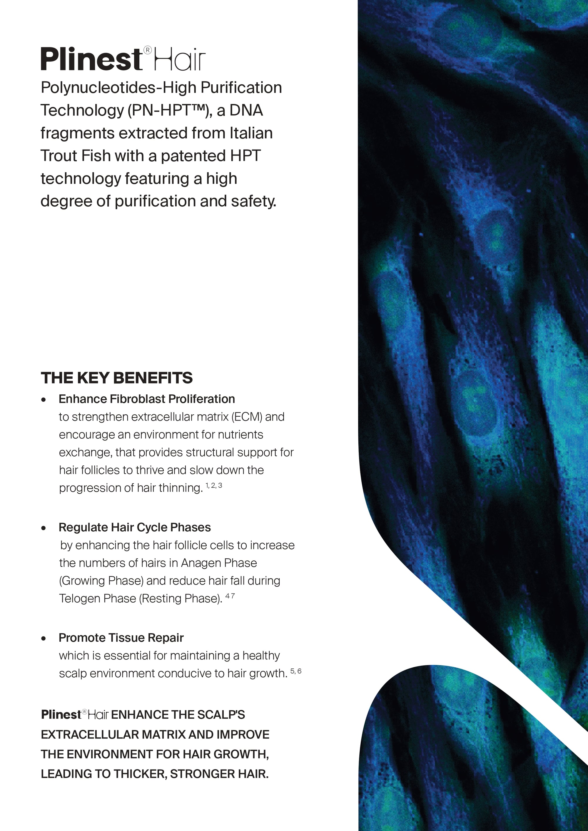 • Enhance Fibroblast Proliferation to strengthen extracellular matrix (ECM) and encourage an environment for nutrients exchange, that provides structural support for hair follicles to thrive and slow down the progression of hair thinning.