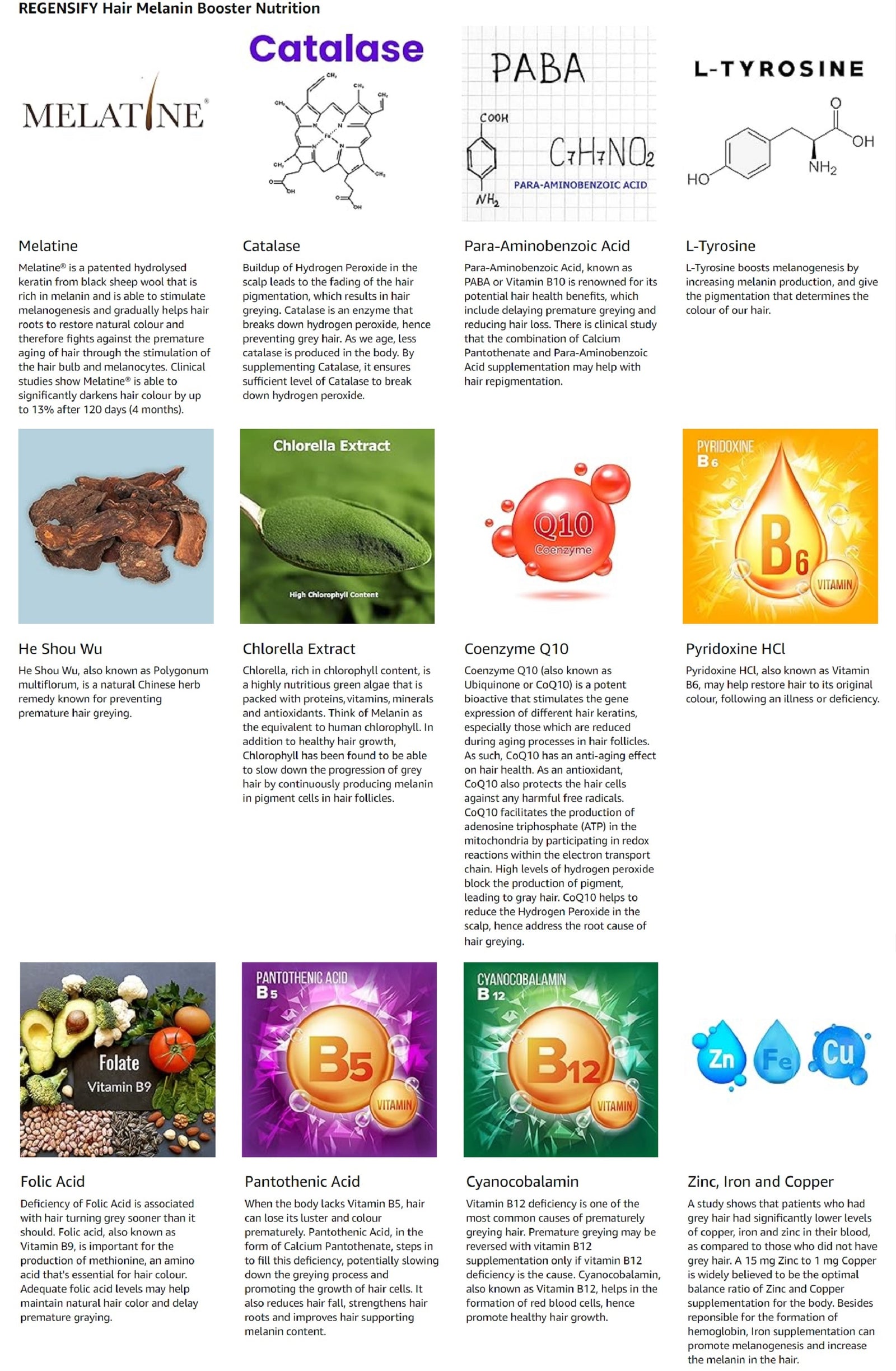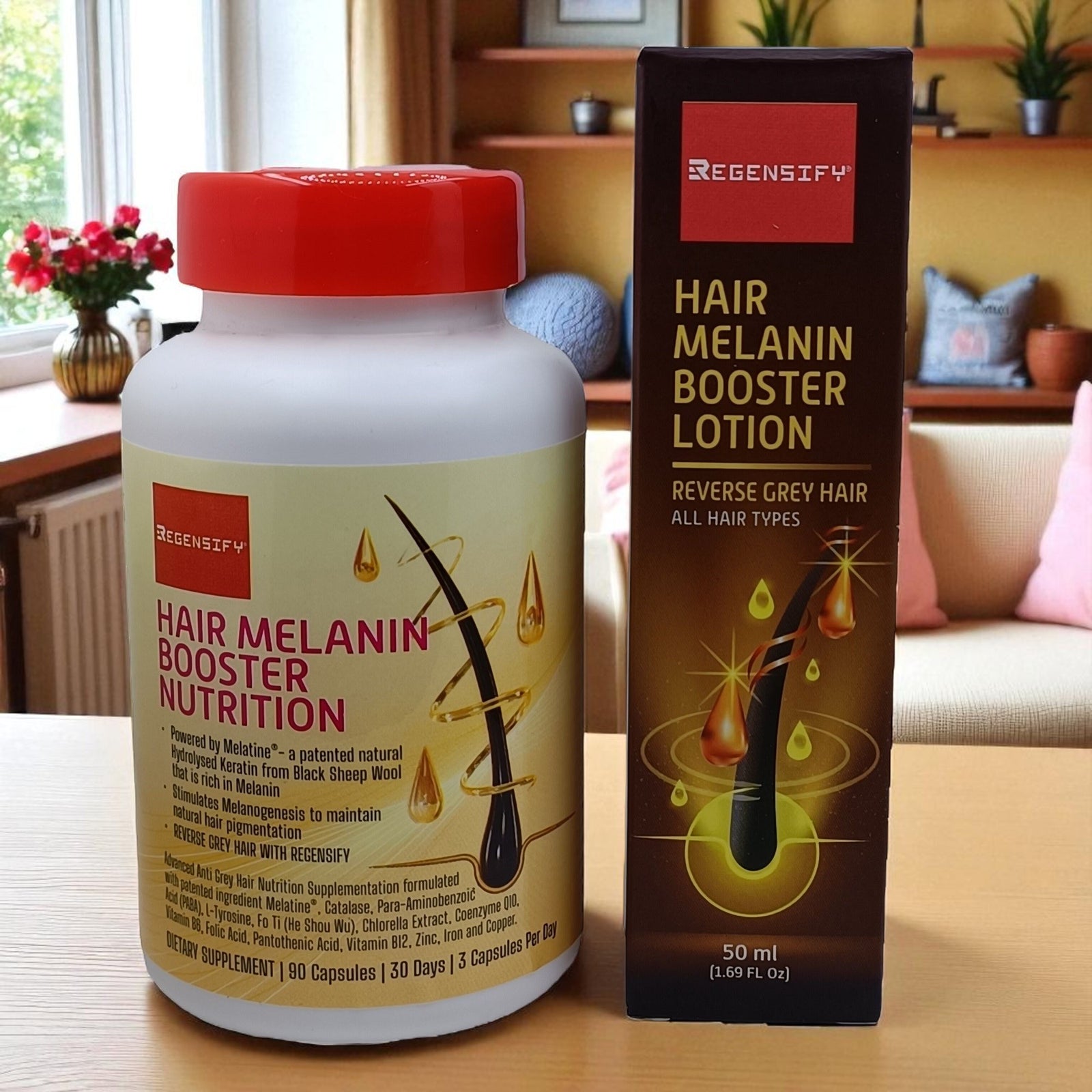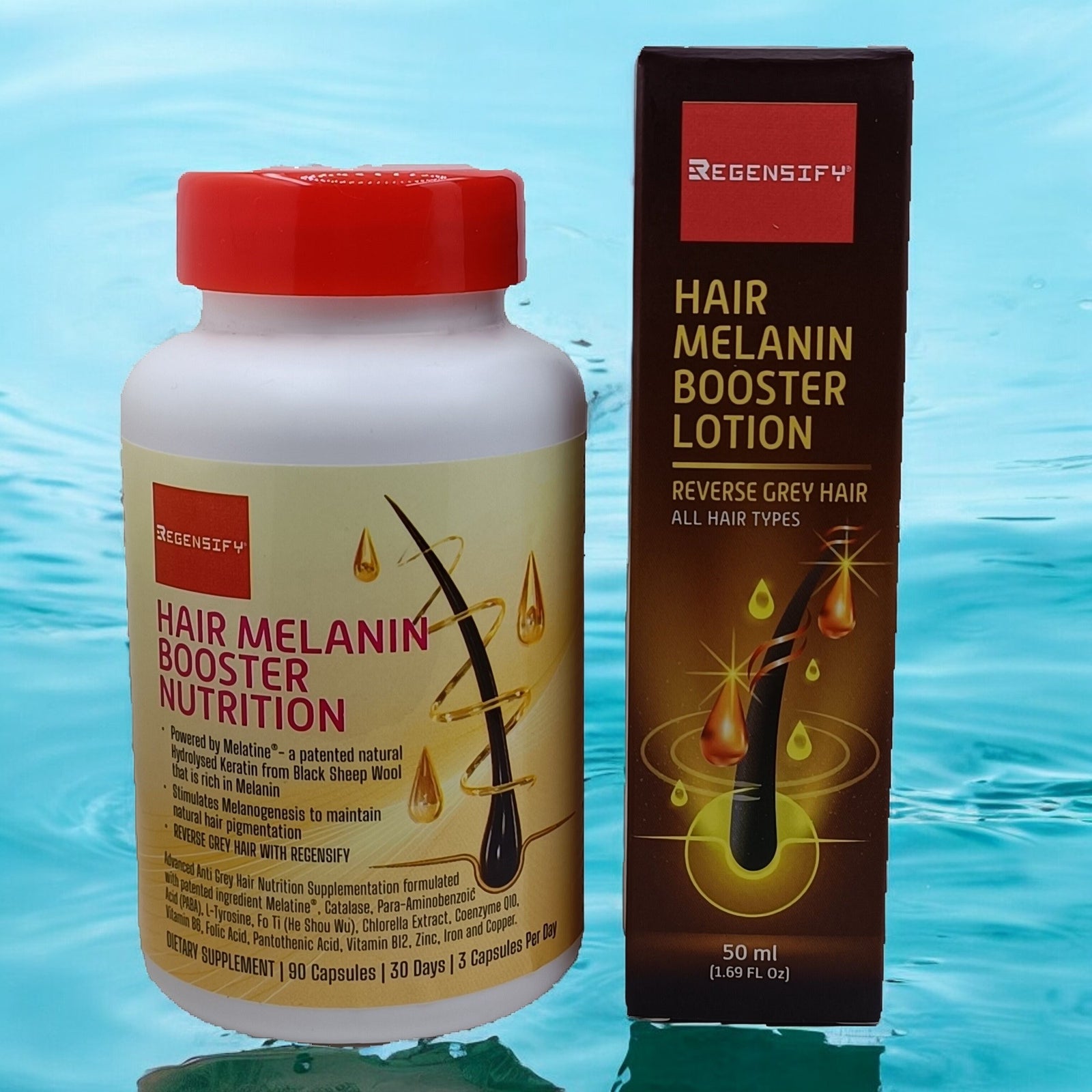 The REGENSIFY Hair Melanin Booster Bundle is the ultimate anti grey hair bundle. Combining the lotion with supplement will have a 1+1 greater than 2 effect, so you will see faster and better results. Get the Lotion + Supplement bundle deal to enjoy greater savings. We recommend taking both the REGENSIFY Hair Melanin Booster Lotion and the REGENSIFY Hair Melanin Booster Nutrition together for the first 4 to 6 months for the best possible results.