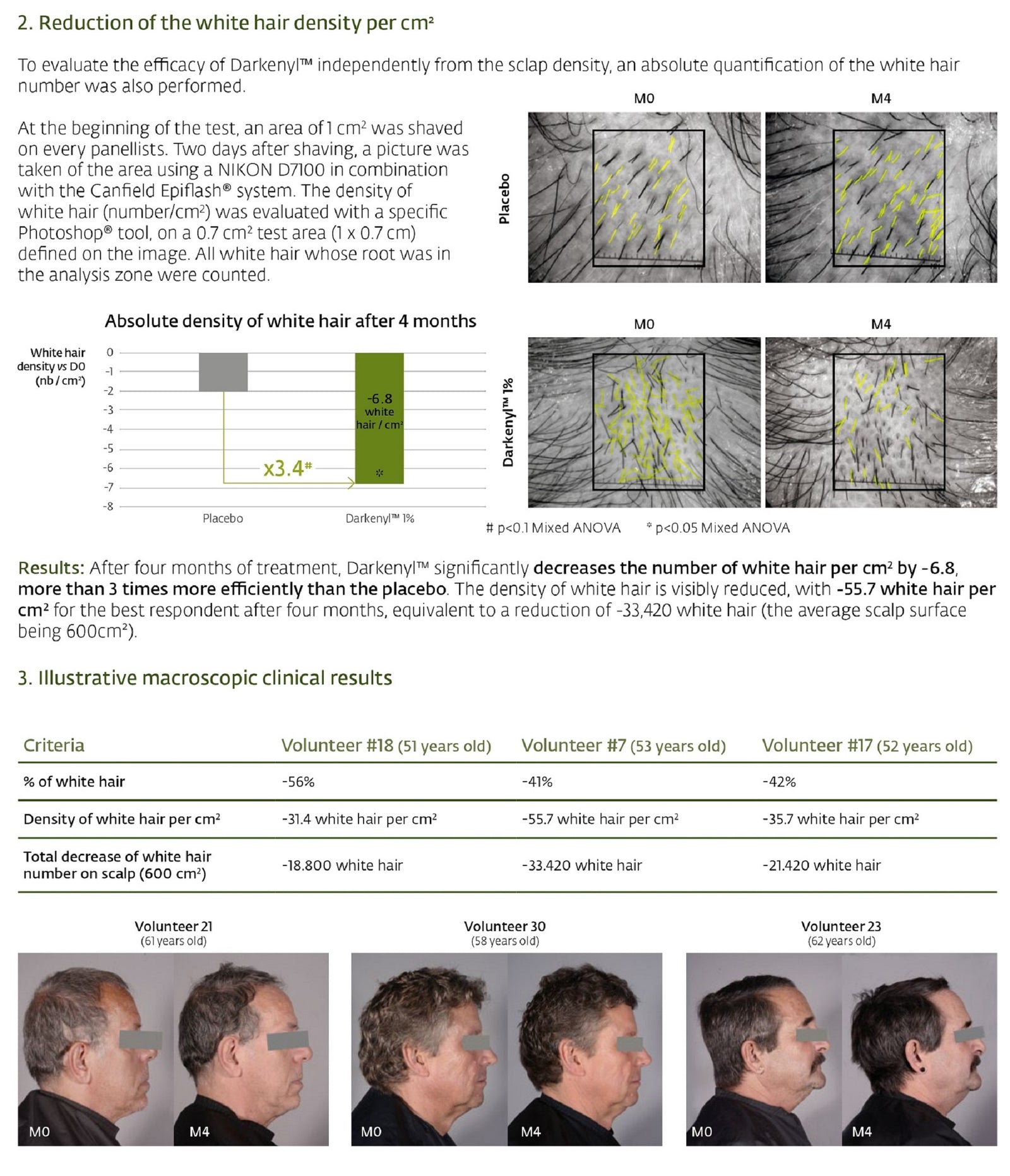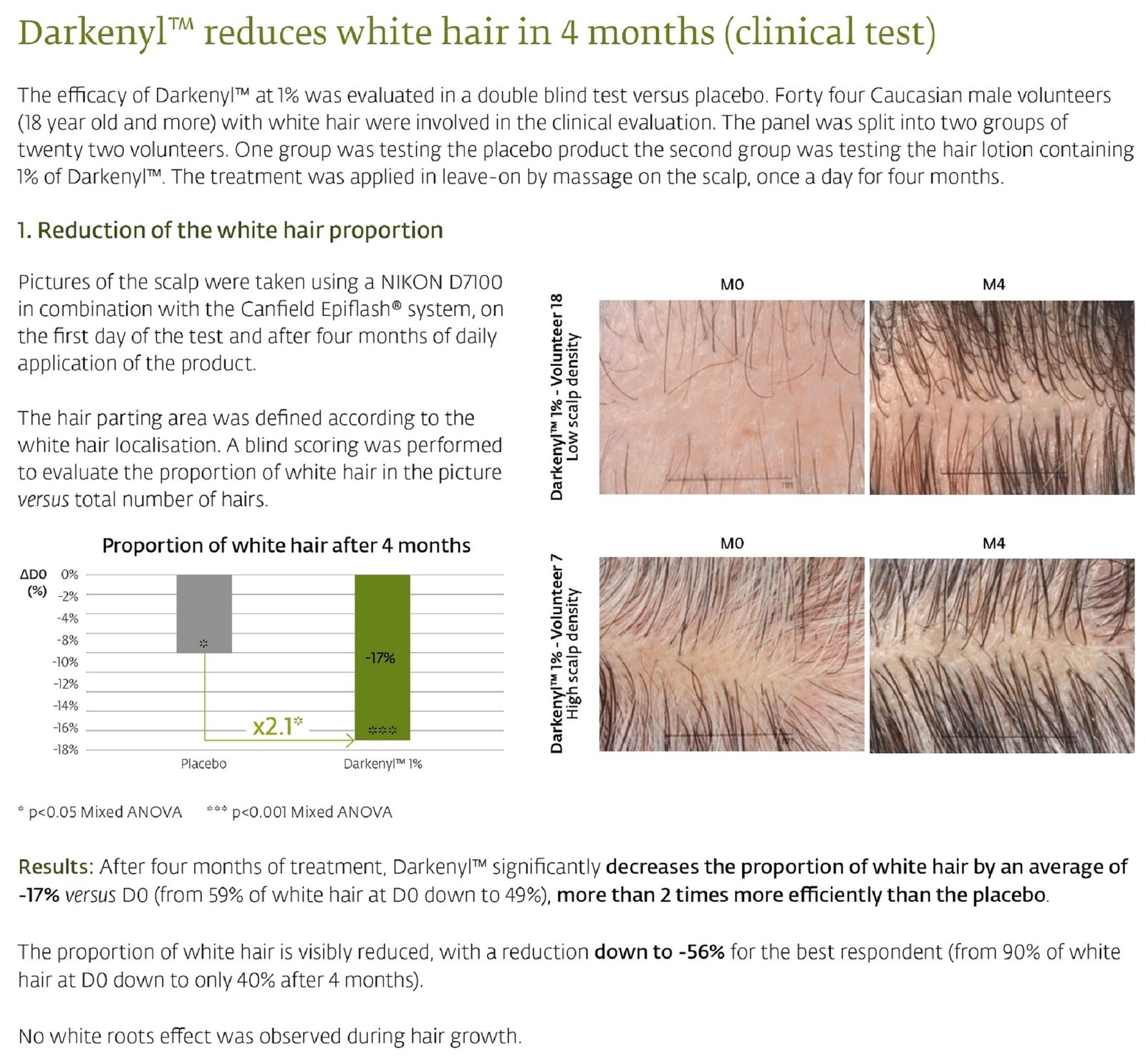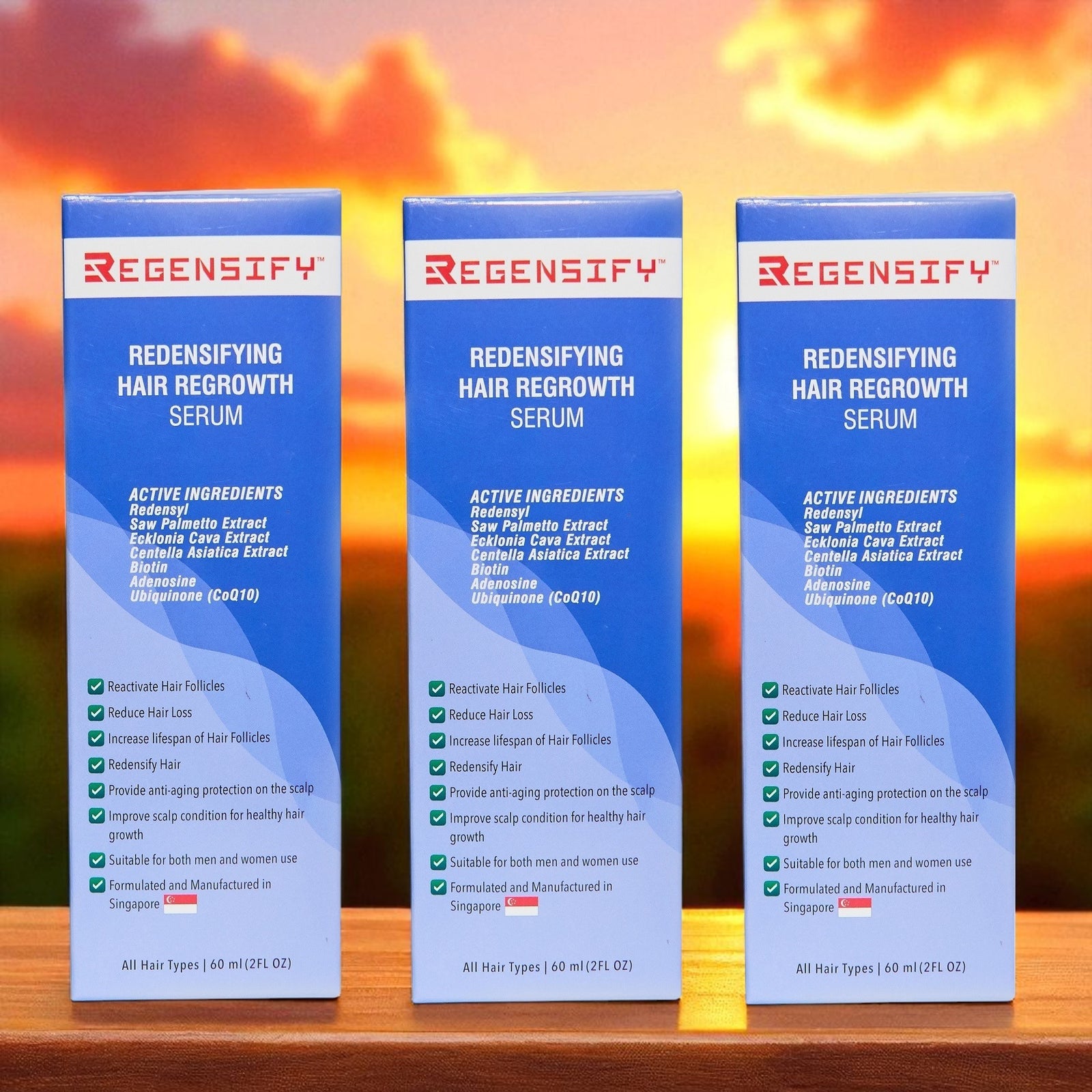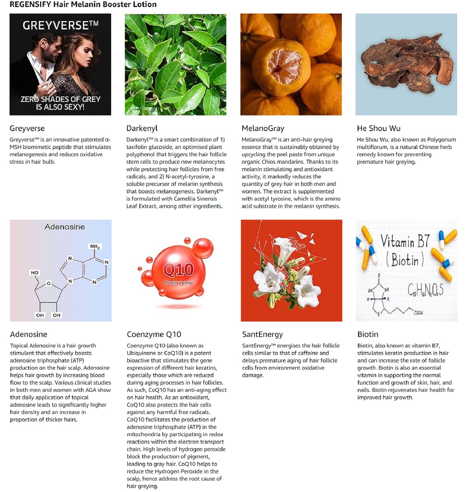Item No. 1: Powered with three patented innovative ingredients (2% Greyverse™, 1% Darkenyl™ and 2% MelanoGray™), the REGENSIFY Hair Melanin Booster Lotion is a revolutionary leave on lotion that can significantly help boost grey hair reversal and reduce the appearance of grey hair density without dyes or colorants. Greyverse™ contains an innovative α-MSH Biomimetic peptide that is able to stimulate the natural pigmentation process to recover a natural hair color. Both Darkenyl™ and MelanoGray™ contain Acetyl Tyrosine, which acts as Melanin Booster. The lotion is further enhanced with He Shou Wu, Adenosine, Coenzyme Q10, SantEnergy™ and Biotin to promote healthy hair growth. He Shou Wu is a natural Chinese herb remedy known for preventing premature hair greying. Coenzyme Q10 has anti-aging effects on hair and also protects the hair against hydrogen peroxide buildup (one of the root causes for hair greying) in your scalp. SantEnergy™ energises the hair follicle cells similar to that of caffeine and delays premature aging of hair follicle cells from environment oxidative damage. Adenosine and Coenzyme Q10 work synergistically by boosting and facilitating ATP production to stimulate the hair.