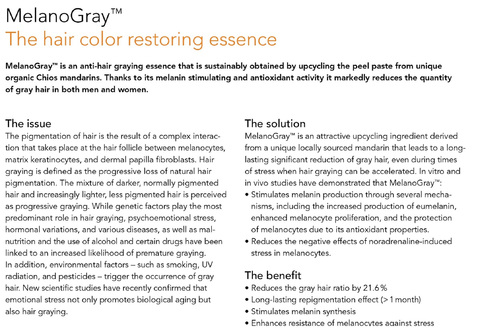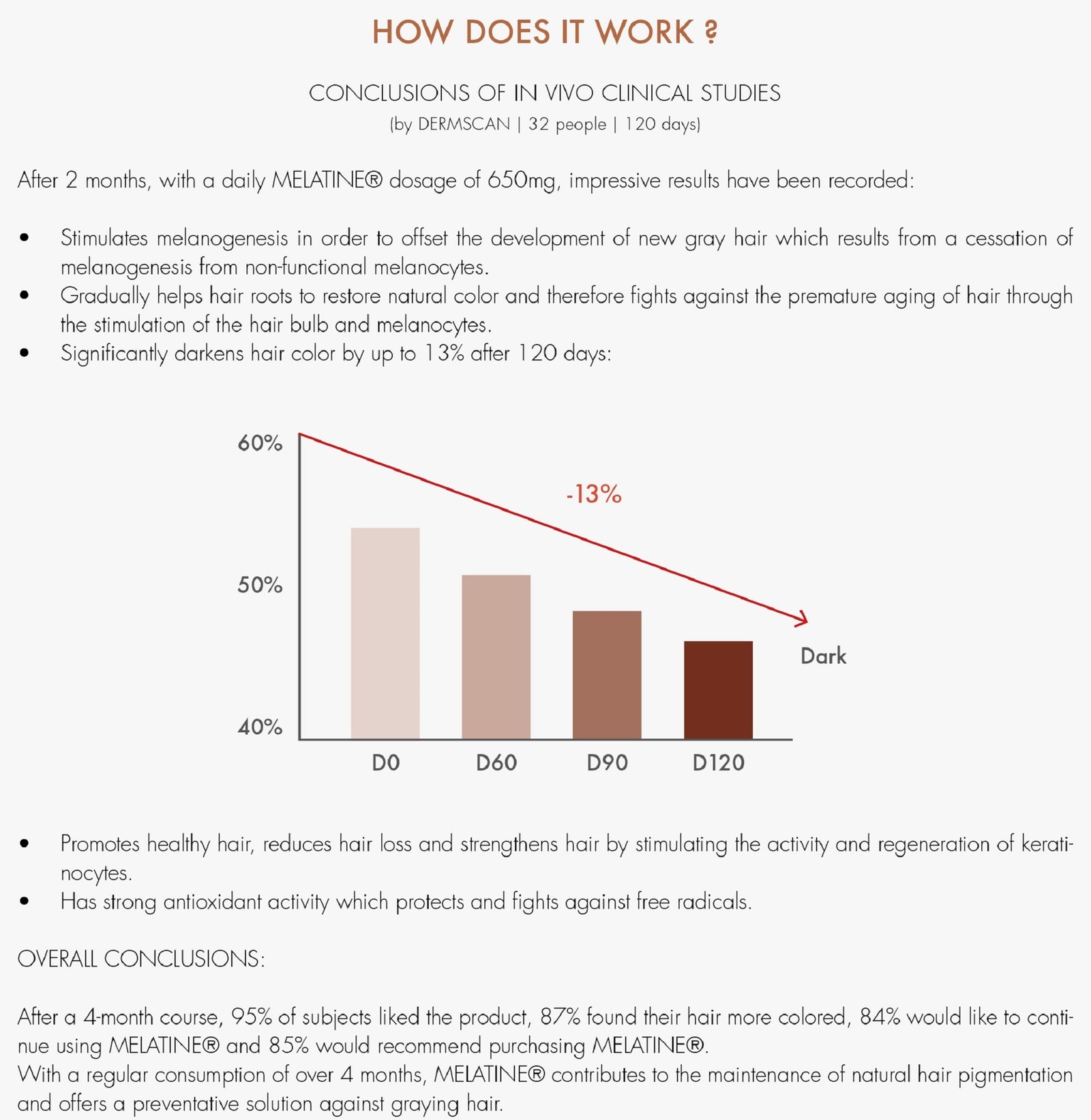 Item No. 2: Advanced Anti Grey Hair Nutrition Supplementation formulated with patented ingredient Melatine®, Catalase, Para-Aminobenzoic Acid (PABA), L-Tyrosine, Fo Ti (He Shou Wu), Chlorella Extract, Coenzyme Q10, Vitamin B6, Folic Acid, Pantothenic Acid, Vitamin B12, Zinc, Iron and Copper. It is powered by Melatine®, a patented natural hydrolysed keratin from Black Sheep Wool that is rich in Melanin, which stimulates melanogenesis to maintain natural hair pigmentation.