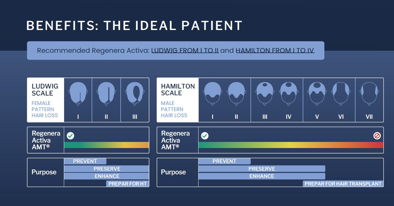 正如方案所示,诊断至关重要。 AMT® 仅对 AGA 型脱发是很有效的。因此,务必了解患者的 AGA 是否伴有其他病症,例如休止期脱发、头皮炎症或其他病症,因为这些都会完全影响治疗的成功率。重要的是,患者不能患有晚期进展性脱发,并且需要有正常的血液检查结果。