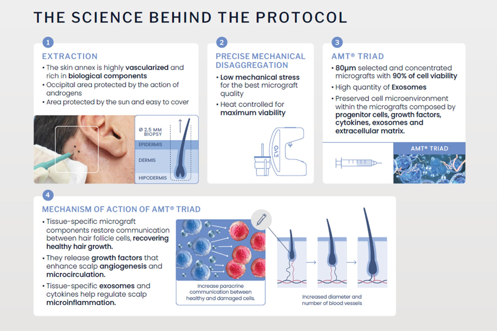 通过 AMT® 疗法,医生可以获得一种微移植溶液,该溶液来自皮肤活检,并且与受体部位具有相同的胚胎学起源(同源),这意味着通过该疗法激活的通路比 PRP 疗法更具特异性。此外,与 PRP 不同,AMT® 疗法产生的溶液不仅含有生长因子,还含有保留在患者头皮中的祖细胞。这些细胞将持续释放细胞因子、趋化因子和生长因子,以增强受影响区域的再生特性,且效果可持续数年。因此,愈合效果将更加显著,结果将更好且更持久。